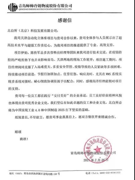 項(xiàng)目執(zhí)行過程中,正值新冠疫情在我國冷鏈行業(yè)肆虐之時(shí),北自科技團(tuán)隊(duì)展示了良好的精神風(fēng)貌和職業(yè)素養(yǎng),克服了重重困難,以認(rèn)真的態(tài)度、專業(yè)的管理和過硬的技術(shù)感動了客戶,客戶特地發(fā)來感謝信,以表彰北自科技團(tuán)隊(duì)在項(xiàng)目中的突出表現(xiàn)。