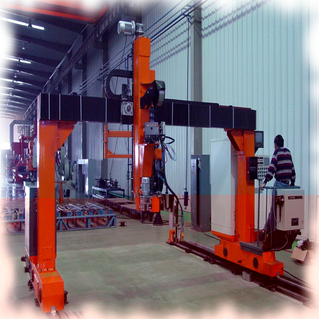 ● 龍門所配二臺焊機(jī)、保護(hù)氣氣瓶(至少2個)、控制柜等均放在龍門兩側(cè)托架上,隨龍門一起移動,進(jìn)龍門的外部供電線纜采用滑線供給,使得龍門移動范圍加大。
